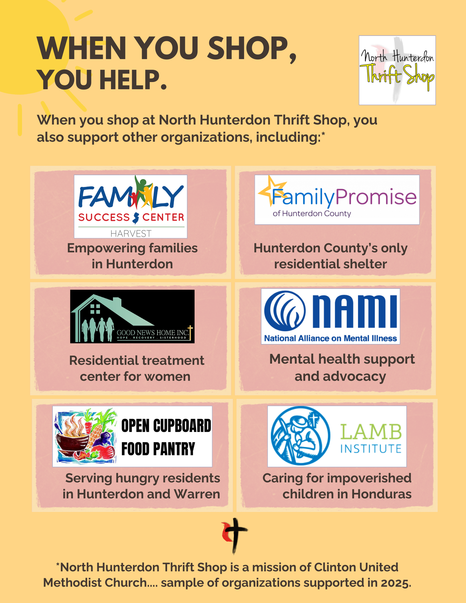 The North Hunterdon Thrift Shop offers clothing, home goods, and more to people who want to stretch their budget or reduce waste and pollution. And when you shop with us, the proceeds help us to support both local and global charities, including: